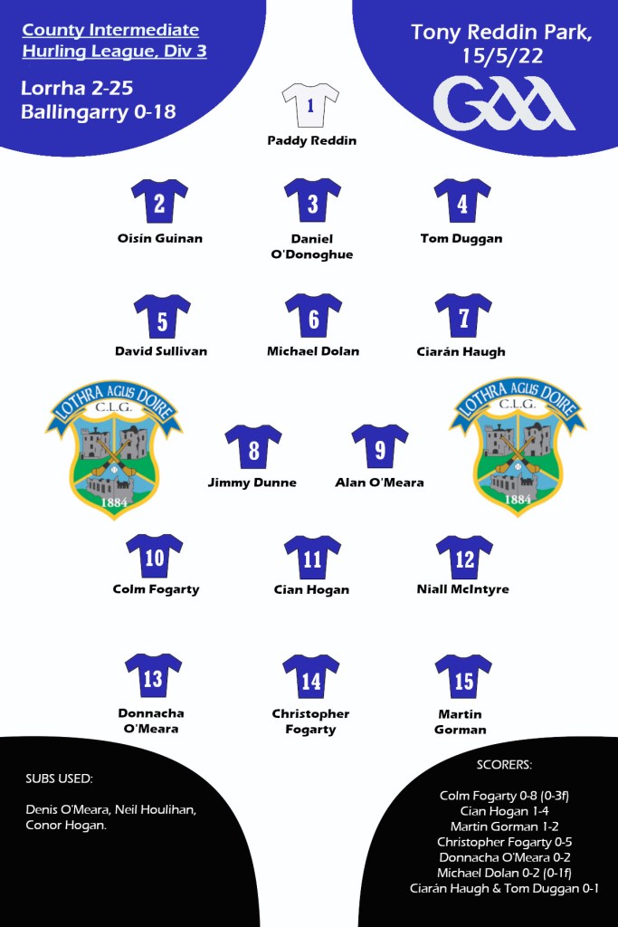 The win means we’re assured of top spot in our group, and will qualify for a Division 3 semi-final against Ballina. Well done to all involved. Our results so far, and the table, can be found here.