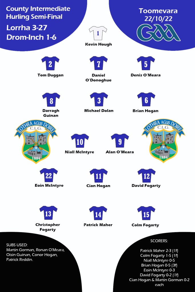 Well done to our Intermediate hurlers who enjoyed a comprehensive victory over Drom-Inch in the County Intermediate Hurling semi-final in Toomevara on Saturday afternoon.
